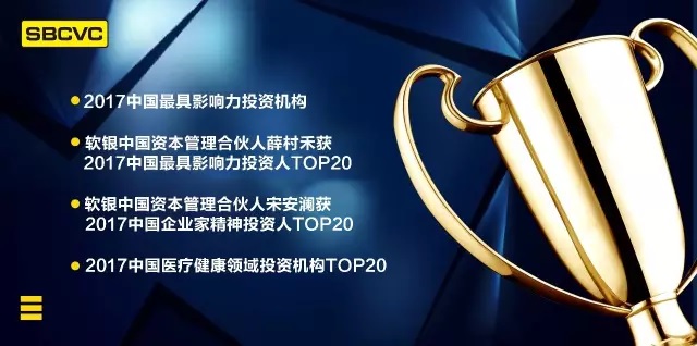 2017中国最具影响力投资机构 2017中国医疗健康领域投资机构TOP20 软银中国资本管理合伙人薛村禾获 2017中国最具影响力投资人TOP20 软银中国资本管理合伙人宋安澜获2017中国企业家精神投资人TOP20