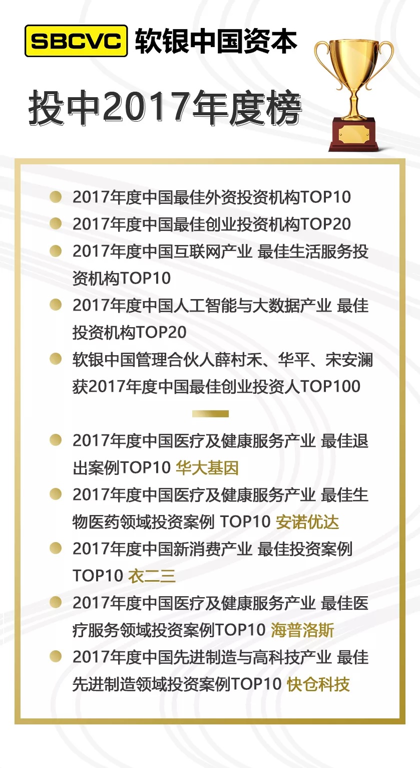 在过去一年中,中国资本市场价值投资理念深入人心,2018年4月23日-25日,由投中信息主办的“价值的力量”第十二届中国投资年会•年度峰会在上海盛大召开。值此年度盛事,投中"2017中国股权投资年度排名颁奖典礼"同时揭晓。软银中国资本凭借出色的投资业绩、专业的投资团队,荣登“2017年度中国最佳外资投资机构TOP10”与“2017年度中国最佳创业投资机构TOP20”榜单,并斩获其余多项殊荣。